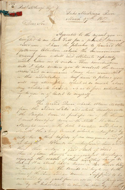 Wentzel, Willard Ferdinand. Fifteen letters from Wentzel at Mackenzie River to Roderick Mackenzie, 1807-1824. An electronic transcription. MFTP #0012 No 1 Page 1 Rodk McKenzie Eqr Forks MacKenzie River March 27th 1807 Dear Sir, Agreeable to the request you intimated me last Fall per a printed memorandum – I have the pleasure to forward the following Collection – which the inconveniences arising from a dull and illiterate capacity – would allow me to make[.] These considerations will I hope, enduce you to overlook the many errors and inaccuracies I may have committed in this undertaking[.] My desire to please you will my attempting what is so much above my abilities to handle – So as to from entertaining to you or of credit to myself[.] The Grand River which obtains its waters from the Slave Lake and which divulges into the Pacific Ocean is perhaps one of the Longest & most beautiful Rivers in the North[.] It Steers a Straight course with little variation and has a Smooth tho' Strong Current which is interupted by only two or three rapids of no consequence and of no length – Islands lie interspersed here and there then contain a good Stock of wood[.] Thus it glitters, through an ungratified Country enjoying the waters of three middling Long Rivers[.] It is about half a league or two thirds broad in widest Place[.] The Banks are high on both Sides of the River and are Barren – Supposed to be occasioned by the great fires made in the Spring Season by the Inhabitants to clear the Country of under [1] L E G E N D : |
