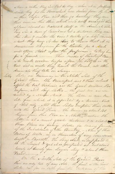 Wentzel, Willard Ferdinand. Fifteen letters from Wentzel at Mackenzie River to Roderick Mackenzie, 1807-1824. An electronic transcription. MFTP #0012 8 Straw or rather Hay and Put to dry – when it is perfectly dried they fix the Horns which were severed from the Head in their Proper Place, and then go hunting[.] [T]hey run their arm in this Skin which is So well arranged thus appears almost as natural itself as the Animal[.] [W]hen they See a drove of Carriboux at a distance, they wave this Skin & make the cries & tricks of a live Carribou which they bring So close to them that it is sometimes dangerous for the Hunter, for a Male will often Shart upon the performer – taking him for a female[.] Their modes of Hunting Beaver is to make wooden traps upon the Lodges in the Fall, and in winter they trench the Beaver, all other Animals they take in Snares[.] Lakes Lakes are numerous on the North Side of the Grand River. The Principal ones & those which afford the best Fisheries are the Great Willow, Porcupine, and Long Lakes[.] The first two are connected by a Narrow Strait[.] The latter is near Bear Lake from which it is seperated by a narrow Neck of Land only[.] All these Lakes empties their outlets into the Grand River[.] The Former is about 40 Leagues form this Place: in a North direction the Latter is at a much greater distance & is also Nort[h.] These Places are fishing abodes for many families of the Inhabitants of the Country[.] None of these Bodies of water are in themselves of any considerab[le] length or Breadth[.] The Long Lake is supposed to be the Longest & yet it is computed at but about twenty or twenty five Leagues Long & about three Broad[.] On the South Side of the Grand River there are only two of any Note, the first is the Trout Lake, not far in land from the Entrance of the [8] L E G E N D : |