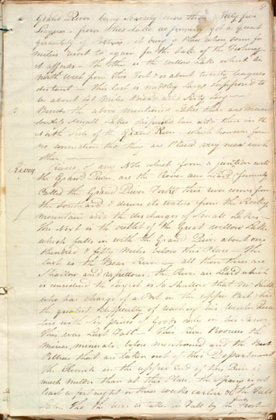 Wentzel, Willard Ferdinand. Fifteen letters from Wentzel at Mackenzie River to Roderick Mackenzie, 1807-1824. An electronic transcription. MFTP #0012 9 Grand River being Scarcely more than Forty five Leagues – from this Lake we formerly got a Great quantity of Peltries, it being a Place where some families resort to again for the Lake of the Fishery it affords[.] The other is the willow Lake which lies north west form this Fort & is about twenty leagues distant[.] This last is middling Large supposed to be about 40 miles Broad and Sixty Long[.] Besides the above mentioned Lakes there are numberless small Lakes dispersed here and there in the North Side of the Grand River – which however form no connection tho' they are Placed very near each other[.] Rivers Rivers of any Note which form a juntion with the Grand River, are the River aux Liard (formerly Called the Grand River Forks) this river comes from the Southard & derives its waters from the Rocky mountain and the discharges of Small Lakes[.] The Next is the outlet of the Great Willow Lake which falls in with the Grand River about one Hundred & fifty miles below this place[.] The last is the Bear River[.] [A]ll these three are Shallow and rapidous, the River au Liard which is considered the Largest is So Shallow that Mr Keith (who has charge of a Post in the upper Part,) had the greatest difficulty of reaching his Winter Quarters with Six pieces of Goods only in his Canoe[.] This was Last Fall[.] This River Produces the mines, minerals, before mentioned and the Best Peltries that are taken out of this Department[.] The Climite in the upper End of this River is much milder than at this Place, the Spring is at least a fortnight or three weeks earlier & the Fall Later, Tho the river is taken in Fall by the Frost[.] [9] L E G E N D : |