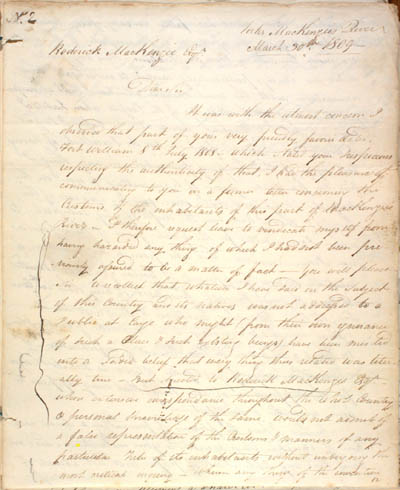 Wentzel, Willard Ferdinand. Fifteen letters from Wentzel at Mackenzie River to Roderick Mackenzie, 1807-1824. An electronic transcription. MFTP #0012 No 2 Forks MacKenzie River March 30th 1809 Roderick MacKenzie Esqr Dear Sir, It was with the utmost concern I observed that part of your very friendly favour dated, Fort Williams 8th July 1808 – which Stated your suspicions respecting the authenticity of that, I had the pleasure of communicating to you in a former letter concerning the Customs of the inhabitants of this part of MacKenzie's River[.] I therefore request leave to vindicate myself from having hazarded any thing of which I had not been previously assured to be a matter of fact[.] You will please Sir to recollect that whatever I have said on the Subject of this Country and its natives was not addressed to a public at large who might (from their own ignorance of such a lace & such existing beings) have been misled into a Sordid belief that every thing thus related was literally true[.] But directed to Roderick MacKenzie Esqr – whose extensive correspondance throughout the whole Country & personal Knowledge of the Same, would not admit of a false representation of the Customs & manners of any particular Tribe of its inhabitants, without undergoing most critical inquiry[.] Wherein any thing of the inventive or [33] L E G E N D : |