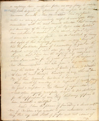 Wentzel, Willard Ferdinand. Fifteen letters from Wentzel at Mackenzie River to Roderick Mackenzie, 1807-1824. An electronic transcription. MFTP #0012 or imposing kind must have fallen an easy prey to detection and have subjected the reputation of the compiler to the most censorious remarks[.] These considerations thus supported made me always particularly careful to investigate every circumstance with the most minute attention, that an imperfect knowledge of the Language of the People whose habits I have endeavored to describe, would admit, before I layed it down as a matter of fact[.] [N]or do I recollect of having lost sight of this necessary precaution in any thing I had the particular favour of transmitting to you on the subject – unless (as I observed above from my ignorance of the Languge), that I have been the dupe of my interpreter, to whom I am indebted for the greater part of the information I communicated – and who from a long residence, mong the natives for upwards of twelve years, is admitted to have the most thorough knowledge of any other in Country of their manners, Customs & Language[.] Being nevertheless unwilling to be suspected of tacitly placing too great a confidence in this Channel of information – I Shall esteem myself gratefully obliged to Mr McKenzie for the suppression of any thing that may appear to him, incredible or doudtful[.] Inclosed I have the pleasure of forwarding a Small col[l]ection of Canadian Songs agreeable to you instructions – and am Sorry that my little Stock of paper will not admit of my [34] L E G E N D : |