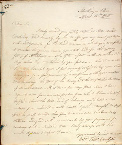 Wentzel, Willard Ferdinand. Fifteen letters from Wentzel at Mackenzie River to Roderick Mackenzie, 1807-1824. An electronic transcription. MFTP #0012 No 3 MacKenzies' River April 18th 1810 Dear Sir, I duly received your justly esteemed Letter dated Terrebonne, and humbly by leave to offer you my most grateful acknowledgements, for the Kind manner in which you was pleasd to mention the generous concern you Still had for the young gentry of Athabasca – who often reflect with sorrow in the days when they were honored by your presence – and it is with the most heartful regret I feel myself obliged to by your Kind indulgence for a postponement of a compliane with your instructions respecting this part of the Country and the unfinished Customs of its inhabitants[.] It is but a few days past, Since I have began to recover from an indisposition from which I have Sensibly Suffered Since the latter end of February, with little or no intermission – and it is with trouble I gather Strength to support myself to wite these few lines – in order to Shew my attention and good will – as well as to by your forgiveness for venturing such a Scribbled letter[.] Being always with the utmost difference & respect Dear Sir Your much honored Servant Willd Ferdd Wentzel [37] L E G E N D : |