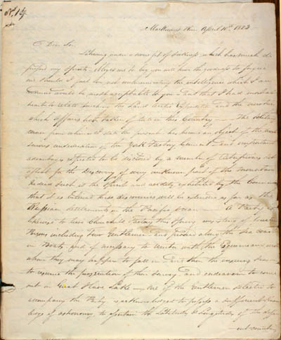 Wentzel, Willard Ferdinand. Fifteen letters from Wentzel at Mackenzie River to Roderick Mackenzie, 1807-1824. An electronic transcription. MFTP #0012 No 14 MacKenzie River April 10th 1823 Dear Sir, Labouring under a severe fit of sickness, which has much depressed my Spirits – obliges me to beg you will have the goodness to forgive me should I fail in not communicating the intelligence which I am convinced would be most acceptable to you – and that I had most at heart to relate touching the Land Arctic Expedition and the new turn which Affairs have taken of late in this Country[.] The solitary corner from whence I date the present – has become an object of the most serious consideration of the [York] Factory Council – and imputant advantages expected to be disclosed by a number of Enterprises Set afloat for the Discovery of every unknown part of the mountains[.] Indeed such is the spirit and avidity exhibited by the Council that it is believed these discoveries will be extended as far as the Russian Settlements on the Pacific Ocean[.] A Party is likewise to leave Churchill Factory this Spring, consisting of fourteen Persons including Two Gentlemen – and proceed along the Sea coast in Boats – and if necessary to winter with the Esquimeaux, with whom they may happen to fall in – and then the ensuing Season to resume to prosecution of their Survey – and endeavour to come out in Great Slave Lake[.] [O]ne of the Gentlemen selected to accompany the Party, is acknowledged to possess a sufficient Knowledge of astronomy to assertain the Latitudes & Longitudes of the differ -ent countries [85] L E G E N D : |
