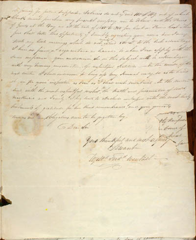 Wentzel, Willard Ferdinand. Fifteen letters from Wentzel at Mackenzie River to Roderick Mackenzie, 1807-1824. An electronic transcription. MFTP #0012 one penny for future support[.] Salaries do not exceed 100 ₤ Stg out of which Clerks must purchase every personal necessary, even to Tobacco – and the Prices of Goods at the Bay are at the rate of 150 to 300 per Cent on Prime Cost[.] Therefore shall take this opportunity of humbly requesting your advice how I may Settle my little earnings, which do not exceed 500 ₤ to the best advantage[.] I have no friend or acquaintance in Canada, to whom I can apply with the Same confidence – your condescension ir on this Subject will be acknowledged with every becoming consideration of respectful gratitude[.] In the course of the next winter I shall endeavour to bring up my Journal ready so as to hand it in for your inspection as soon as I shall reach montreal[.] In the meantime with the most respectful wishes the Health and preservation of Mrs MacKenzie and Family – I beg leave to conclude impressed with the most lively Sentiments of gratitude for her Kind remembrance and your generosity towards me – obligations never to be forgotten by Dear Sir Your thankful and most res[pectful] Servant Willd Ferdd Wentzel [87] L E G E N D : |