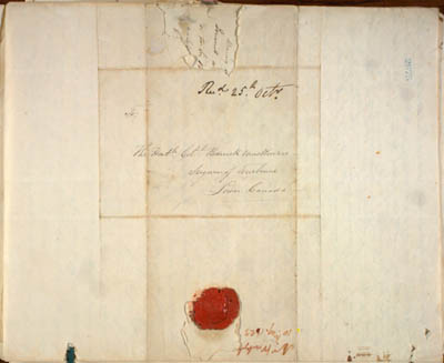 Wentzel, Willard Ferdinand. Fifteen letters from Wentzel at Mackenzie River to Roderick Mackenzie, 1807-1824. An electronic transcription. MFTP #0012 Recd 25th Octr [address] To, The Honble Coll Roderick MacKenzie Seigneur of Terrebonne Lower Canada [red seal] [docket] Mr Wentzel 10th ap 1823 [88] L E G E N D : |