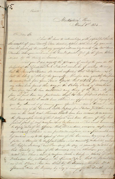 Wentzel, Willard Ferdinand. Fifteen letters from Wentzel at Mackenzie River to Roderick Mackenzie, 1807-1824. An electronic transcription. MFTP #0012 No 15 (Private) MacKenzies River March 1st 1824 Dear Sir, I have the honor to acknowledge with respectful thanks the reciept of your Friendly Favor dated in April 1823, and beg you will have the goodness to accept my grateful acknowledgements for Mrs MacKenzie's Kind remembrance, & the humble sense I feel for the favor bestowed on me by the Family in General[.] Last year I did myself the pleasure of writing to you on the Subject of the Expedition, and I do not remember of writing to any but Mr James McKenzie so much respecting that Enterprize – as I took the liberty of Stating to yourself[.] Therefore was greatly surprized to understand from your Kind Epistle that extracts from Some of my Letters had found their way in the Public Prints of Montreal[.] I am Sure never to have authorized any thing of the Kind – So far from it had been my particular wish to have preserved silence on that head until I could have obtained an opportunity of laying before you my Journal & of craving your opinion and advice thereon[.] I have not seen any of the Canada Public Papers, few I believe find their way now in the North West – otherwise should have had occasion to examine the Paragraphs touching that subject and have Known if they had formed part of my correspondance to Canada[.] This much however may be safely said of the Officers, that acted on some occasions imprudently[,] injudiciously & showed in one particular instance are unpardonable want of conduct[.] As to the report of some of the Canadian voyageurs having fallen a Sacrifice to Support others – it is currently circulated amongst the Copper Indians, and I am sorry to Say is generally credited in this Country[.] Some of the Survivors now in Athabasca give full credit and shew a desire to confirm Such a belief[.] Besides Doctor Richardson has published in the London Papers – that Mr Robert Hood (one of the Officers) had been Shot by the Iroquois & that he (Dr R.) afterwards Killed the Iroquois, by way of revenge for the Death of his Friend [89] L E G E N D : |