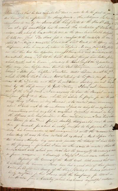Wentzel, Willard Ferdinand. Fifteen letters from Wentzel at Mackenzie River to Roderick Mackenzie, 1807-1824. An electronic transcription. MFTP #0012 Friend – and that he had concealed the deed in order to be the first to give [these] sad tidings to the unfortunate Mr Hood's Friends[.] This intelligence has been communicated to me by Mr James Leith Chief Factor to the Honble Hbay Co[.] I am at a loss nevertheless how to reconcile this declaration of Doctor Richardson with what he has written to me on the same lamentable subject – for he tells me – That "Poor Hood fell a sacrafice to the hardships he was exposed to"[.] And in a conversation I had with Lieutt Back in the spring at Fort Chepewean, when he was on his return to England – he very candidly told me that there had been dissentions amongst themselves, and concluded with these remarkable words – "To tell the truth Wentzel things have taken place which must not be known" – alluding to hat befel the Expedition on their way from Copper mine River to Fort Enterprise[.] Last Fall I recieved a Letter from Captain Franklin dated London March the 7th in which he States that he ordered 600 ₤ Sterling to be paid me for my Services to the Expedition and that he intended Sending me out His Journal by the Ship coming to York Factory[.] I have not however heard yet of the Ship news[.] I am anxious to have the Perusal in order to compare facts & to Know whether it would be proper for me to write every thing I Know, in my Journal, or to curtail some occurrences, which I could wish to do – because I find no delight in exposing circumstances which might be considered Criminal conduct, in one of the Officers who has Survived & been rewarded[.] I once had a Sincere Esteem for him, and feel it doubly disagreeable now to accuse him of conduct, for which he richly merited to be punished[.] B[e]sides his Commander is not unacquainted with the circumstances whose duty it is to have noticed it as Such[.] But I fear I am too tidious, therefore beg you will pardon the liberty I have taken in the foregoing – for which I have no other excuse to make – than the condescension with which you have had the generosity to indulge me on former occasions – a Kindness I hope I shall never abuse[.] Respecting the Concerns of the North West – little occurs that can be interesting to Canada[.] Furrs have lost a great deal of their former value in Europe and many of the Chief Factors & Traders would willingly compound for their Shares, with the Company, for 1500 ₤ in order to retire from a Country, which has become disgustful & irksome to [90] L E G E N D : |