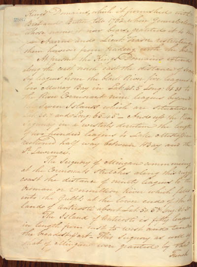 McKenzie, James. Some Account of the King's Posts, the Labrador Coast, and the Island of Anticosti by an Indian Trader Residing there Several Years with a Description of the Natives and the Journal of a trip through those Countries in 1808 by the Same Person. An electronic transcription. MFTP #0017 King's Domains, which it furnished with Beef and Butter till 1762 when general Murray, whose name it now bears, granted it to major Nairne and Lieut. Fraser restricting them however from trading with the Indians[.] At present the Kings Domains extend along the coast north east the distance of seventy six leagues from the black River five leagues below Murray Bay in Lat: 48.5 Long: 68.38 to the River Cormorant nine leagues beyond the seven Islands which are situated in Lat: 50.7 and Long: 65.45 – And up the River Sagunay in a westerly direction the length of two hundred leagues to Lake Mistassini reckoned half way between HBay and the St Lawrence. The Seignory of Mingan commencing at the Cormorants stretches along this rugged coast the distance of ninety leagues to the Oroman or Vermillion River which falls into the Gulph at the lower end of the Island of Anticosti about Lat: 50.5 & Long: 61.30[.] The Island of Anticosti is fifty leagues in length from east to west and ten in the broadest part[.] This Seignory as well as that of Mingan were granted by the French [6] L E G E N D : |