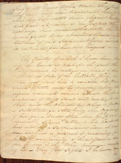 McKenzie, James. Some Account of the King's Posts, the Labrador Coast, and the Island of Anticosti by an Indian Trader Residing there Several Years with a Description of the Natives and the Journal of a trip through those Countries in 1808 by the Same Person. An electronic transcription. MFTP #0017 King of forty leagues of this coast[.] They keep aloof from every other trader[.] At their factory where they have erected some elegant building and have a preacher of the Gospel they exchange their commodities with the Eskimaux for Oil Bears Martens & foxes[.] The distance of this settlement from Quebec is reckoned five hundred leagues[.] The Country of which I have been drawing the limits is perhaps the part the least favoured by nature in point of climate and soil of the habitable globe[.] Man was placed here to exercise his carnivorous appetite only by preying upon the inferior animals around him – for the soil, composed of moss sand and rock, is too sterile and the climate too cold to produce a substitute for satisfying the cravings of hunger[.] And often does he poor miserable sinner' retire to his hard cold bed without a supper – and leave it next without a prospect of procuring for himself and family a breakfast a dinner or any of the other common necessaries of life[.] Very few sights I believe can be [8] L E G E N D : |