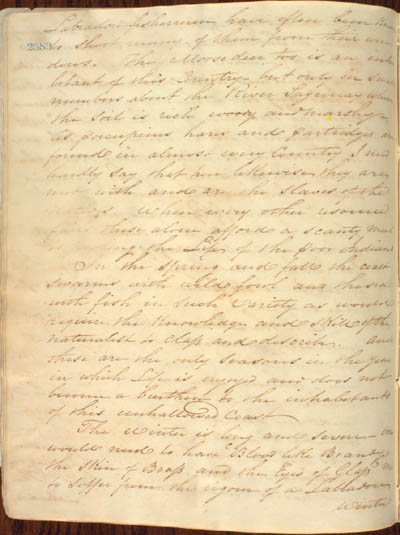 McKenzie, James. Some Account of the King's Posts, the Labrador Coast, and the Island of Anticosti by an Indian Trader Residing there Several Years with a Description of the Natives and the Journal of a trip through those Countries in 1808 by the Same Person. An electronic transcription. MFTP #0017 Labradore fishermen have often been known to shoot many of them from their windows. The Moose deer too is an inhabitant of this Country – but only in small numbers about the River Sagunay where the soil is rich woody and marshy[.] As porcupines hares and partridges are found in almost every Country I need hardly say that here likewise they are met with and are the slaves of the natives. Where every other resource fails these alone afford a scanty meal to prolong the Life of the poor Indians. In the spring and fall the coast swarms with wild fowl and the sea with fish in such variety as would require the knowledge and skill of the naturalist to class and describe. And these are the only seasons in the year in which Life is enjoyed and does not become a burthen to the inhabitants of this unhallowed coast[.] The winter is long and severe – one would need to have 'Blood like Brandy, the skin of Brass and the Eyes of Glass' not to suffer from the rigour of a Labradore winter [10] L E G E N D : |