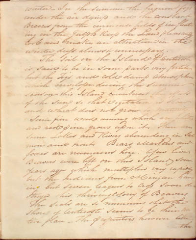 McKenzie, James. Some Account of the King's Posts, the Labrador Coast, and the Island of Anticosti by an Indian Trader Residing there Several Years with a Description of the Natives and the Journal of a trip through those Countries in 1808 by the Same Person. An electronic transcription. MFTP #0017 winter[.] In the summer the frequent fogs under the air damp and the constant Breezes from the immense fields of ice floating in the Gulph keep the Land pleasantly cool and make an alteration in the winter dress almost unnecessary. The soil on the Island of Anticosti is said to be in some parts very fertile but the Fogs and cold damp atmosphere which envelope during the summer season this Island counteract the effects of the seen so that vegetation is slow and wheat does not grow to maturity[.] Some fine wood among which are white and red pine grows upon it. There are some Lakes and Rivers abounding in salmon and trout. Bears Martens and foxes are numerous here. A few live beavers were left on this Island some years ago which multiplied very rapidly but the Indians from Mingan having but seven leagues to cross soon destroyed this thriving colony of Beavers[.] The Seals are so numerous that the shore of Anticosti seems to be their native place[.] The Proprietors however like the [11] L E G E N D : |