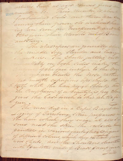 McKenzie, James. Some Account of the King's Posts, the Labrador Coast, and the Island of Anticosti by an Indian Trader Residing there Several Years with a Description of the Natives and the Journal of a trip through those Countries in 1808 by the Same Person. An electronic transcription. MFTP #0017 articles such as axes knives guns ammunition &c. Their number is about five hundred souls and there are some among them grown old without having ever seen an European and who still form their utensils out of Bones and stone. The Nascapees are generally above the middle size slender and long shanked. The cheeks jutting out remarkably on both sides make the contour of the face incline to the oval[.] The eyes are black the nose rather flat mouth capacious lips thick the teeth white the hair rough & black and the complexion of a beautiful frog colour gives the last touch to this antic figure. The men dress in a Capot Brayet and Leggins of Carriboux skin prepared in the hair which they wear at all seasons next the skin the outside Being painted in various fantastical figures of different colours, which they extract from wood & herbs, and the shoulders decorated with Epaulettes made of Beads porcupine Quills [18] L E G E N D : |