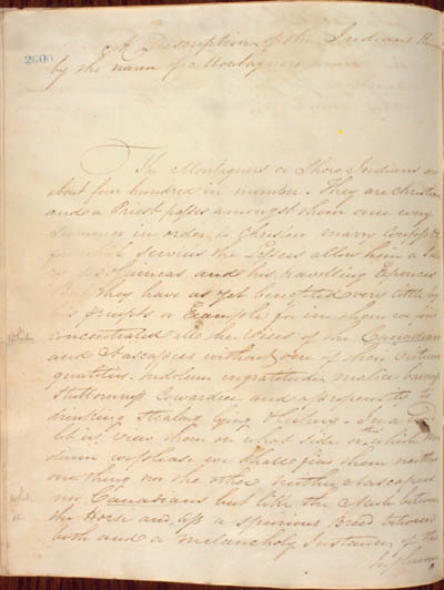 McKenzie, James. Some Account of the King's Posts, the Labrador Coast, and the Island of Anticosti by an Indian Trader Residing there Several Years with a Description of the Natives and the Journal of a trip through those Countries in 1808 by the Same Person. An electronic transcription. MFTP #0017 A Description of the Indians known by the name of Montagners The Montagners or Shore Indians are about four hundred in number. They are christians and a Priest passes amongst them once every summer in order to christen marry confess &c. for which services the Lessees allow him a salary of 50 Guineas and his travelling Expences[.] But they have as yet benefited very little by his precepts or Example for in them we find concentrated all the vices of the Canadians and Nascapees without one of their virtuous qualities[.] Indolence ingratitude malice baseness stubbornness Cowardice and a propensity to drinking stealing lying & lechery[.] In a word let us view them on what side or which medium we please we shall find them neither one thing nor the other neither Nascapees nor Canadians but like the Mule between the Horse and less a spurious Breed between both and a melancholy Instance of the Influence [32] L E G E N D : |