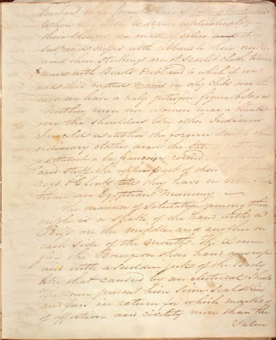 McKenzie, James. Some Account of the King's Posts, the Labrador Coast, and the Island of Anticosti by an Indian Trader Residing there Several Years with a Description of the Natives and the Journal of a trip through those Countries in 1808 by the Same Person. An electronic transcription. MFTP #0017 Penchant those females have of falling backward. When they wish to appear captivatingly fine their sleeves are made of calico they suspend crosses with ribband to their necks[,] and their stockings are of scarlet cloth trimmed with beads & ribband to which if we add their matted manes in oily clubs over the ears we have a truly grotesque figure before us[.] Neither men nor women wear a blanket over the shoulders like other Indians[.] In cold weather the former double their ordinary clothes and the latter fasten a petticoat a la françoise round their loins and stuff the upper Part of their Robes with rags & Clouts till they have no better shape than an Egyptian mummy. The manner of salutation among these people is a shake of the hand with a Buss on the middle and another on each side of the mouth[.] The Women give the Bourgeois their hand accompanied with a sudden jerk of the Body like that caused by an electrical shock[.] The men present him some seal skins and furs in return for which marks of of affection and civility more than the Value [35] L E G E N D : |