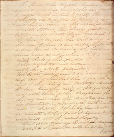 McKenzie, James. Some Account of the King's Posts, the Labrador Coast, and the Island of Anticosti by an Indian Trader Residing there Several Years with a Description of the Natives and the Journal of a trip through those Countries in 1808 by the Same Person. An electronic transcription. MFTP #0017 The Ladies of his Majesty's Domains whether married or unmarried young or old are it must be confessed much inclined to gaiety. Their ideas of chastity are so confined as scarcely to exist and their conscience in this respect as elastic as a silk stocking. They always grant the last favour for a Bottle of rum yet such is the show of modesty they wish to keep up that none of them is ever met without a child or some female companion who however serves more as a key than a lock to the private closets of those prudes. The men aware of this Disposition and naturally very jealous watch them closely – particularily in drinking Frolicks tho' fond of rum to an uncommon excess some of them keep sober to guard the motions of their wives and Daughters. But at the same time they carry on Intrigues of their own with those of their Neighbours for they, any more than their dear Ribs, are not very punctual in observing the tenth commandment. And here I shall beg have to relate, an anecdote which in point of elegance perfectly corresponds with the present subject. About seven years ago lived at chasqua[n] or Bear's Tail a Canadian with his wife who happen'd [39] L E G E N D : |