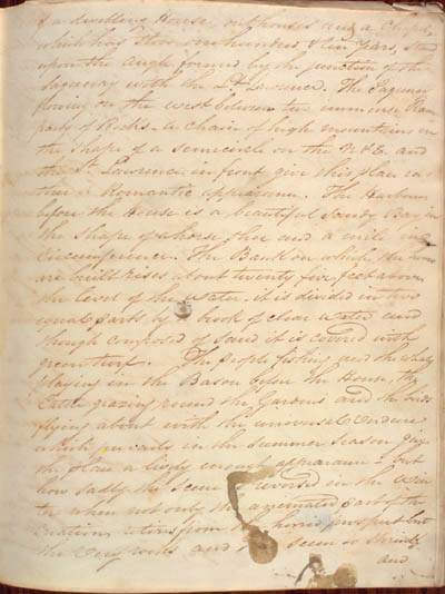 McKenzie, James. Some Account of the King's Posts, the Labrador Coast, and the Island of Anticosti by an Indian Trader Residing there Several Years with a Description of the Natives and the Journal of a trip through those Countries in 1808 by the Same Person. An electronic transcription. MFTP #0017 of a dwelling House, outhouses and a chapel, which has stood one hundred & ten years, stand upon the angle formed by the junction of the Sagunay and the St Lawrence. The Sagunay flowing on the west between two immense Ramparts of Rocks – a chain of high mountains in the shape of a semicircle on the N & E. and the St Lawrence in front give this place rather a Romantic appearance. The Harbour before the House is a beautiful sandy Bay in the shape of a horse shoe and a mile in circumference. The Bank on which the houses are built rises about twenty five feet above the level of the water – it is divided in two equal parts by a brook of clear water and though composed of sand it is covered with green turf. The people fishing and the whales playing in the Bason before the House, the Cattle grazing round the Gardens and the birds flying about with the universal verdure which prevails in the Summer season gives the place a lively enough appearance – but how sadly the scene is reversed in the winter when not only the animated part of the creation retires from the horrid prospect but the very rocks and Trees seem to shrink and [61] L E G E N D : |