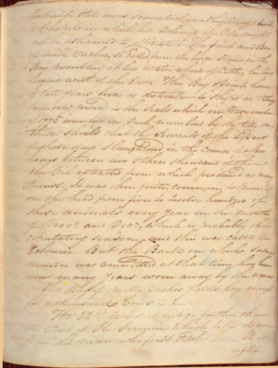 McKenzie, James. Some Account of the King's Posts, the Labrador Coast, and the Island of Anticosti by an Indian Trader Residing there Several Years with a Description of the Natives and the Journal of a trip through those Countries in 1808 by the Same Person. An electronic transcription. MFTP #0017 Portneuf still owes several elegant buildings besides a Chapel in which his Holiness the Pope might not be ashamed to officiate. The point and Bay of Mille Vaches, so called from the large stones in the Bay resembling at low water a herd of Cattle, lie two leagues west of the Post. This Bay & point have of late years been as destructive to ships as they formerly proved to the seals which in November of 1775 were left in such numbers by the tide on these shoals that the Servants of the Lessees of those days slaughtered in the course of a few hours between two & three thousand of them the Oil extracted from which produced as many Pounds. It was then quite common to knock on the head from five to twelve hundred of those animals every year in the months of Novr and Decr, which is probably their copulating season – and this was called Un Echourie. But the Bank on which so much murder was committed at that time has been now many years worn away by the waves[.] The Bay of Mille Vaches yields hay enough for a thousand Cows[.] The 22nd we did not go farther than the Post of Ile Jeremie which takes its name from the man who first settled here. It is eight [73] L E G E N D : |