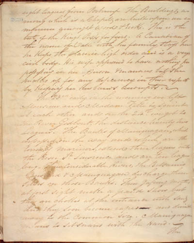 McKenzie, James. Some Account of the King's Posts, the Labrador Coast, and the Island of Anticosti by an Indian Trader Residing there Several Years with a Description of the Natives and the Journal of a trip through those Countries in 1808 by the Same Person. An electronic transcription. MFTP #0017 eight leagues from Portneuf[.] The Buildings, among which is a Chapel, are built upon an eminence amongst wood & rocks. This is the best of the Kings Posts for furs. A Canadian of the name of Vallé with his family stays here he keeps the place in high order and is a very civil body. His wife appeared to have nothing prepossessing in her person & manners but she makes up for any deficiency in these respects by keeping her Husbands accompts. The 23rd early in the morning we left Monsieur and Madam Vallé to squint at each other and on the 24th we got to the River Godbout, the distance twenty two Leagues. The Banks of Maniquagan, which we passed on the way and which are the terror of mariners, extend three leagues into the River St Lawrence and are ten leagues long[.] Three considerable Rivers, the Betsamis Bustard & Maniquagan discharge themselves on those Banks. Their gaping mouths at first sight make a grand show but they are choked at the entrance with sand and they soon become rapid and dwindle away to the common size. Maniquagan means to set snares with the Hand. The [74] L E G E N D : |