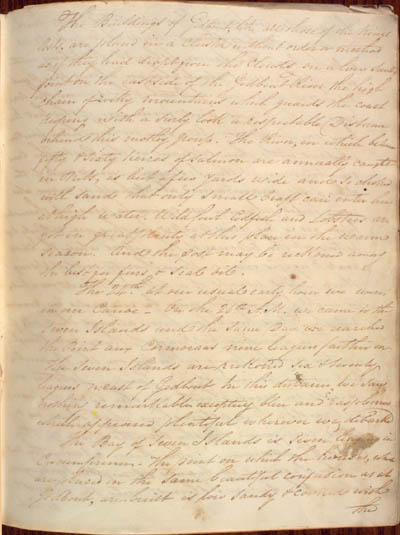 McKenzie, James. Some Account of the King's Posts, the Labrador Coast, and the Island of Anticosti by an Indian Trader Residing there Several Years with a Description of the Natives and the Journal of a trip through those Countries in 1808 by the Same Person. An electronic transcription. MFTP #0017 The Buildings of Godbout, like all those of the Kings Posts, are placed in a cluster without order or method as if they had dropt from the clouds on a low sandy point on the east side of the Godbout River the high chain of rocky mountains which guards the coast keeping with a surly look a respectable Distance behind this motley group. The River, in which between fifty & sixty tierces of salmon are annually caught in Nets, is but a few yards wide and so choked with sand that only small craft can enter her at high water. Wild fowl Codfish and Lobsters are got in great plenty at this place in the warm season. And the post may be reckoned among the best for furs & seal oil. The 24th at our usual early hour we were in our Canoe[.] On the 26th A.M. we came to the Seven Islands and the same Day we rearched the Point aux Cormorans nine leagues further on. The Seven Islands are reckoned six and twenty leagues n: east of Godbout[.] In this distance we saw nothing remarkable excepting blue and raspberries which appeared plentiful wherever we debarked[.] The Bay of Seven Islands is seven leagues in Circumference[.] The point on which the houses, which are placed in the same beautiful confusion as at Godbout, are built is low sandy & covered with the [75] L E G E N D : |