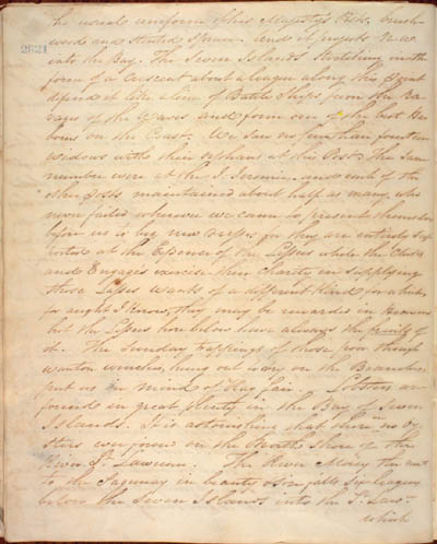 McKenzie, James. Some Account of the King's Posts, the Labrador Coast, and the Island of Anticosti by an Indian Trader Residing there Several Years with a Description of the Natives and the Journal of a trip through those Countries in 1808 by the Same Person. An electronic transcription. MFTP #0017 the usual uniform of his Majesty's Posts, brushwood and stinted spruce. And it projects N.W. into the Bay. The Seven Islands stretching in the form of a crescent about a league along this point defend it like a line of Battle Ships from the ravages of the waves and form one of the best Harbours on the Coast. We saw no fewer than fourteen widows with their orphans at this Post. The same number were at the I: Jeremie – and each of the other posts maintained about half as many who never failed wherever we came to present themselves before us to beg new dresses for they are entirely supported at the Expence of the Lessees while the Clerks and Engagés exercise their charity in supplying those Lasses wants of a different kind for which, for aught I know, they may be rewarded in Heaven but the Lessees here below have always the fruits of it. The Sunday trappings of those poor though wanton wenches, hung out to dry on the Branches, put us in mind of Rag fair. Lobsters are found in great plenty in the Bay of Seven Islands. It is astonishing that there no oysters ever found on the North shore of the River St Lawrence. The River Moisy the next to the Sagunay in beauty & size falls six leagues below the Seven Islands into the St Lawce which [76] L E G E N D : |
