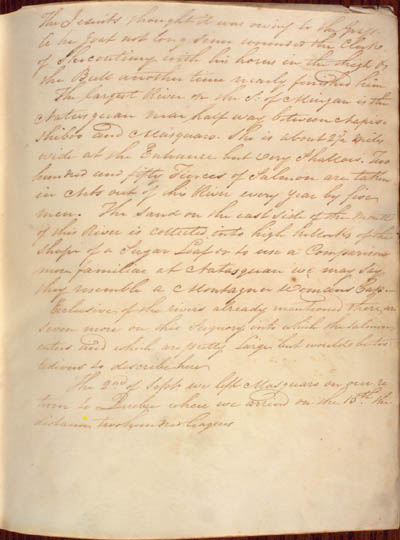 McKenzie, James. Some Account of the King's Posts, the Labrador Coast, and the Island of Anticosti by an Indian Trader Residing there Several Years with a Description of the Natives and the Journal of a trip through those Countries in 1808 by the Same Person. An electronic transcription. MFTP #0017 The Jesuits thought it was owing to the Grass. A he goat not long since wounded the Clerk of Shecoutimy with his horns in the thigh & the Bull another time nearly finished him[.] The largest River on the S. of Mingan is the Nat[a]squan near half way between Napioshiboo and Masquaro. She is about 2½ miles wide at the Entrance but very Shallow. Two hundred and fifty Tierces of Salmon are taken in Nets out of this River every year by five men. The sand on the east side of the mouth of this River is collected into high hillocks of the shape of a Sugar Loaf or to use a Comparison more familiar at Natasquan we may say they resemble a Montagner Womans Cap. Exclusive of the rivers already mentioned there are seven more on this Seignory into which the salmon enters and which are pretty Large but would be too tedious to describe here[.] The 2nd of Septr we left Masquaro on our return to Quebec where we arrived on the 15th the distance two hundred leagues[.] [81] L E G E N D : |