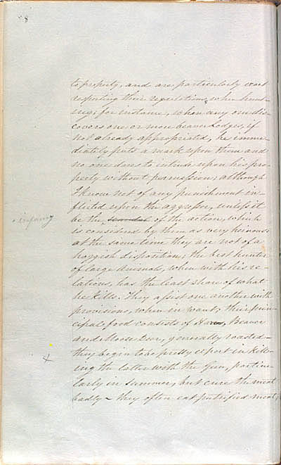 Keith, George. An Account of Mackenzie River (Letters to Roderick Mackenzie), 1807-1817. An electronic transcription. MFTP #0033 8 to property, and are particularly exact respecting their regulations when hunting; for instance, when any one discovers one or more beaver Lodges, if not already appropriated, he immediately puts a mark upon them and no one dares to intrude upon his property without permission; although I know not of any punishment inflicted upon the aggressor, unless it be the scandal of the action, which is considered by them as very heinous: at the same time they are not of a hoggish disposition; the best hunter of large Animals, when with his relations, has the least share of what he kills. They assist one another with provisions, when in want; their principal food consists of Hares, Beaver and Moose Deer, generally roasted – they begin to be pretty expert in killing the latter with the Gun, particularly in summer, but cure the meat badly – they often eat putrified meat, [8] L E G E N D : |