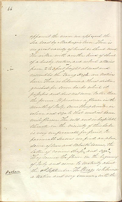 Keith, George. An Account of Mackenzie River (Letters to Roderick Mackenzie), 1807-1817. An electronic transcription. MFTP #0033 66 apparent the nearer we approach the Sea Coast by Mackenzie's River. There is no great variety of bush or shrub wood. The willow with another kind of shrub of a bushy nature, and which attains from 2 to 3 feet height at most and resembles the Young Hazel are Natives here. There is likewise a third distinguished for seven barks which it possesses and does not come taller than the former. It produces a flower in the month of July, something similar in colour and size to that medical Camomile flower. The cold and inhospitable Climate in the vicinity of this Lake is very unfavourable for fruit. In favourable Seasons we find an abundance of Crow and Whortle berries, the latter of various shape and size. They receive the flower in the beginning of July and come to maturity about the 8th of September. The Pirago is likewise a Native and very common, with the [66] L E G E N D : |