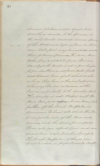Keith, George. An Account of Mackenzie River (Letters to Roderick Mackenzie), 1807-1817. An electronic transcription. MFTP #0033 68 Summer visitors, and a small bird, something similar to the Sparrow, is the only Winter resident. Various Species of the Hawk and Eagle or Nun in Summer. Water fowl may be included under these following Species – The Swan, Bustard, Grey and white Geese, Loons in variety, with Ducks and a few Snipe. A few Sea Plover and fresh water Gulls and Cranes. None of all which make a long stay here, either in passing or returning. We see no vermin at this Post, owing probably to the marshy Soil. This Country is well stocked with the Rein Deer, and a few Moose Deer; and farther off the Musk Buffaloe is numerous. To hunt all which the Natives make use of the Bow and arrows, and the snare principally. Those who can afford Guns and ammunition reap peculiar benefit. The Musk Buffaloe, although very short limbed, is proportionally swift [68] L E G E N D : |