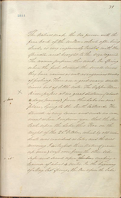 Keith, George. An Account of Mackenzie River (Letters to Roderick Mackenzie), 1807-1817. An electronic transcription. MFTP #0033 71 The Natives make the two former with the fine back of the willow, which after being dried, is very ingeniously twisted with the Spindle and brought to the size required. The women perform this work. In Spring when the fish descend the small rivers they have various as well as ingenious modes of fishing. There are a good many small rivers but of little note. The Copper Mine River passes at no great distance (about 2 days journey) from this Lake in one place, lying to the South Eastward. The Climate is very severe and needs no comment when I inform you that the Ice took upon the Lake this Year on the night of the 25th October, which by old residents was considered as late; and the next morning I witnessed three Natives (grown up men) cross over from the other side safe and sound upon the Ice, making a traverse of about 4 miles. In the beginning of May last spring, the Ice upon the lake [71] L E G E N D : |