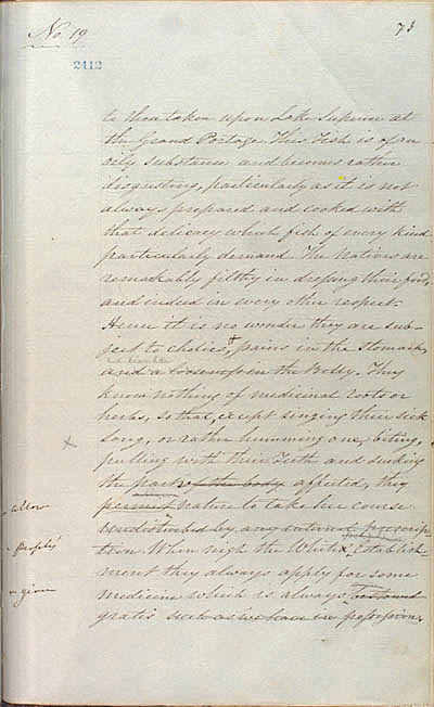 Keith, George. An Account of Mackenzie River (Letters to Roderick Mackenzie), 1807-1817. An electronic transcription. MFTP #0033 73 No. 19 to those taken upon Lake Superior at the Grand Portage. This Fish is of an oily substance and becomes rather disgusting, particularly as it is not always prepared and cooked with that delicacy which fish of every kind particularly demand. The Natives are remarkably filthy in dressing their food, and indeed in every other respect. Hence it is no wonder they are subject to cholics, pains in the stomach, and a looseness in the Belly. They know nothing of medicinal Roots or herbs, so that, except singing their sick Song, or rather humming one, biting, pulling with their Teeth and sucking the part of the body affected, they permit nature to take her course undisturbed by any internal prescription. When nigh the Whites' Establishment they always apply for some medicine which is always bestowed gratis such as we have in possession. [73] L E G E N D : |