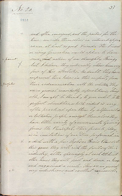 Keith, George. An Account of Mackenzie River (Letters to Roderick Mackenzie), 1807-1817. An electronic transcription. MFTP #0033 77 No. 20. and often consigned, and the parties for the time consider themselves in outward appearance at least as good Friends. The Present or rising Generation would appear to have some fait notion of an almighty Being, but I believe they internally allow him very few of His attributes. No doubt they have improved their Ideas in this respect, from their communication with the whites. They are in general remarkably superstitious, being able, I am apt to think, to give credit to the grossest absurdities, which indeed is very often practised upon them by self-conceited or talkative people amongst themselves. They have little variety of amusements. Gaming forms the Principal. Their favorite play is in imitation of our Dice performed in a dish with a few Eagle's or Bear's Claws; at this game they will risk the fruits of their industry, altho sparingly at each ake: at other times they will feast and dance or Jump and sing round a circle. They are in general very industrious and excellent oeconomists. [77] L E G E N D : |