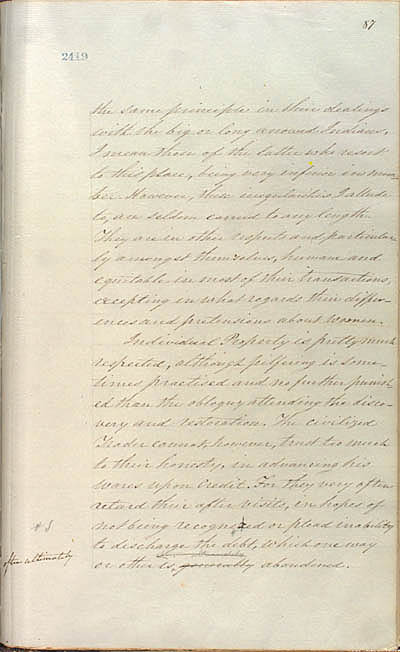 Keith, George. An Account of Mackenzie River (Letters to Roderick Mackenzie), 1807-1817. An electronic transcription. MFTP #0033 87 the same principle in their dealings with the big or long arrowed Indians, I mean those of the latter who resort to this place, being very inferior in number. However, these irregularities I allude to, are seldom carried to any length. They are in other respects and particularly amongst themselves, humane and equitable in most of their transactions, excepting in what regards their differences and pretensions about women. Individual Property is pretty much respected, although pilfering is sometimes practised and no further punished than the obloquy attending the discovery and restoration. The civilized Trader cannot, however, trust too much to their honesty, in advancing his wares upon credit. For they very often retard their after visits, in hopes of not being recognied or plead inability to discharge the debt, which one way or other is generally abandoned. [87] L E G E N D : |