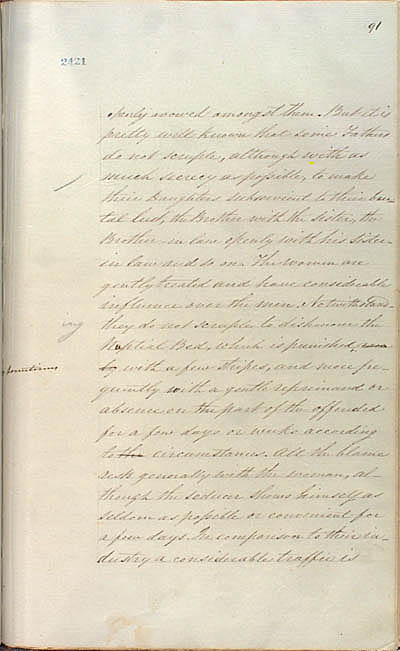 Keith, George. An Account of Mackenzie River (Letters to Roderick Mackenzie), 1807-1817. An electronic transcription. MFTP #0033 91 openly avowed amongst them. But it is pretty well known that some Fathers do not scruple, although with us much secrecy as possible, to make their Daughters subservient to their brutal lust, the Brother with the Sister, the Brother-in-law openly with his Sister-in law and so on. The women are gently treated and have considerable influence over the men. Notwithstand- they do not scruple to dishonour the Nptial Bed, which is punished rarely with a few stripes, and more frequently with a gentle reprimand or absence on the part of the offended for a few days or weeks according to the circumstances. All the blame rests generally with the woman, although the seducer shows himself as seldom as possible or convenient for a few days. In comparison to their industry a considerable traffic is [91] L E G E N D : |