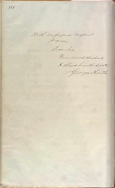 Keith, George. An Account of Mackenzie River (Letters to Roderick Mackenzie), 1807-1817. An electronic transcription. MFTP #0033 126 With unfeigned respect I am Dear Sir, Your most obedient, & obliged humble servt. George Keith [126] L E G E N D : |