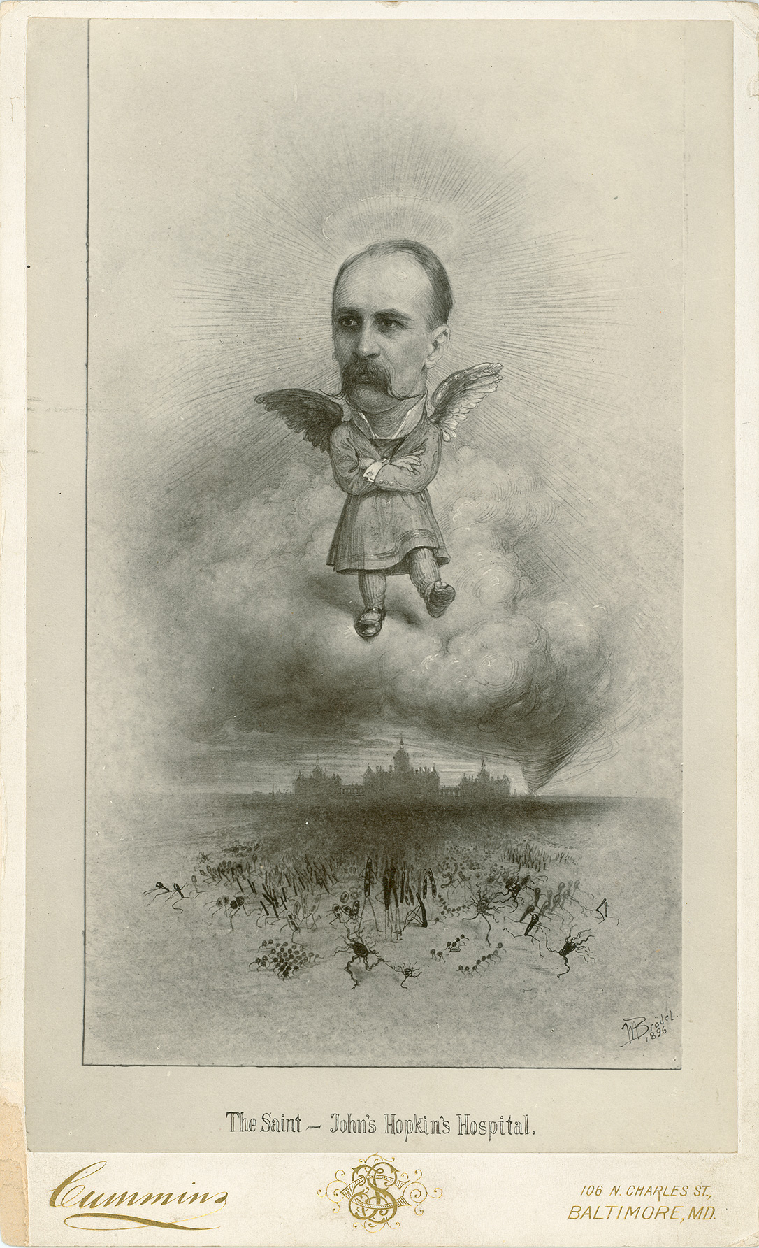 Description: A humourous cartoon of William Osler as a cherub, in charge of a cyclone which is banishing all disease from Johns Hopkins Hospital. The artist, Max Brödel, was a medical illustrator at the hospital. The title of the drawing, "The Saint -- John's Hopkin's Hospital" is due to Osler's habit of referring to the institution as "the St. John's". See Harvey Cushing's "The Life of Sir William Osler" (1925) vol. 1, p. 419.