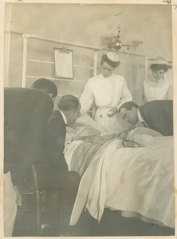 Description: The first of a set of photos showing William Osler treating a patient, probably in Johns Hopkins Hospital; Osler is seated next to the patient's bed. The names of the other individuals are unknown. The photo is titled "Inspection."