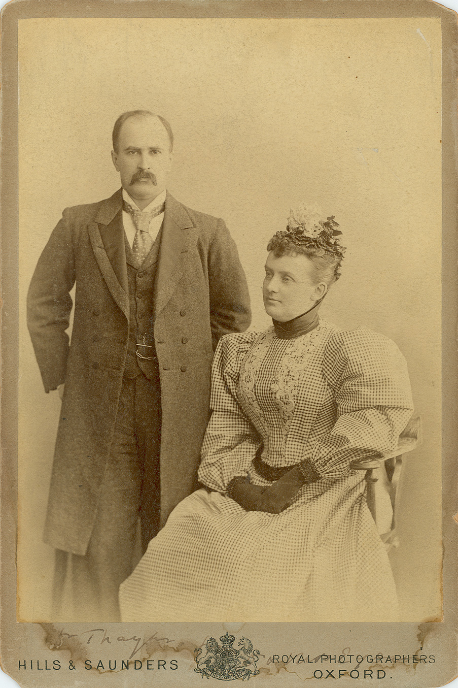 BY APPOINTMENT TO HER MAJESTY Hills & Saunders OXFORD NEGATIVES PRESERVED. COPIES MAY BE HAD AT ANY TIME. This or any other portrait enlarged of reduced and finished in oil or water colour. (Hills & Saunders' crest, transcribed from back of photo)