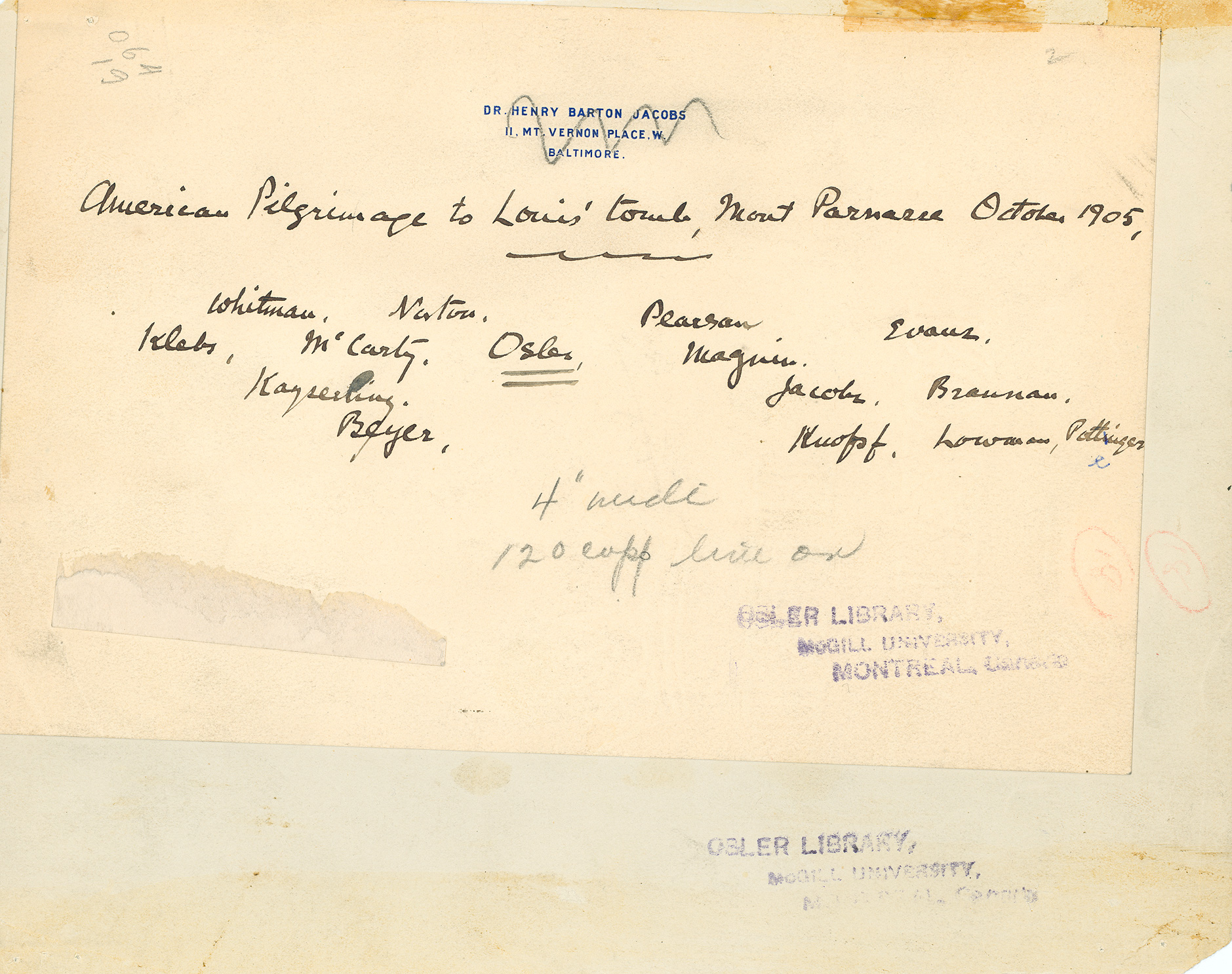 Description: Back of a photo of William Osler with colleagues at the tomb of the famous French physician Pierre-Charles-Alexandre Louis in Paris. Also in the group are Arnold C. Klebs, like Osler an avid collector of medical books, and Henry Barton Jacobs, a former student of Osler's at Johns Hopkins Hospital and his former neighbour in Baltimore.