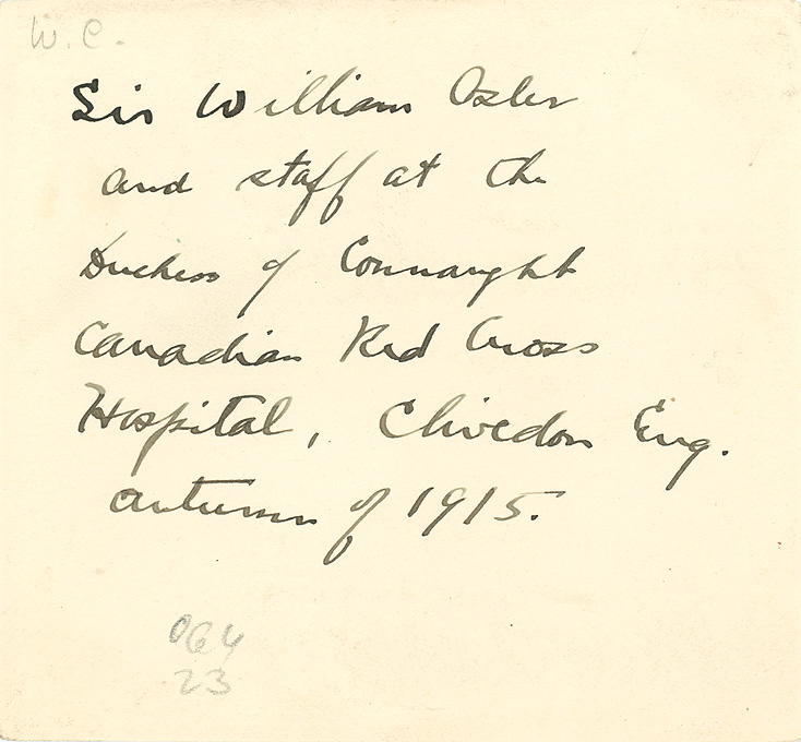 Description: Back of a photo of Sir William Osler with the staff of the Duchess of Connaught Canadian Hospital, in 1915 or 1916. The hospital was located at Cliveden, the Astors' estate in Buckinghamshire, England.