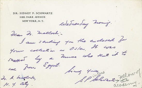 Notes: DR. SIDNEY P. SCHWARTZ 1185 PARK AVENUE NEW YORK, N.Y. Wednesday Morning. Dear Dr. Malloch:- I am sending you the enclosed for your collection on Osler. It was snapped by a nurse who sent it to me from Egypt. Sincerely yours SP Schwartz (Fellow of the Academy.) Dr. A. Malloch, N.Y. City. (transcribed from accompanying note)