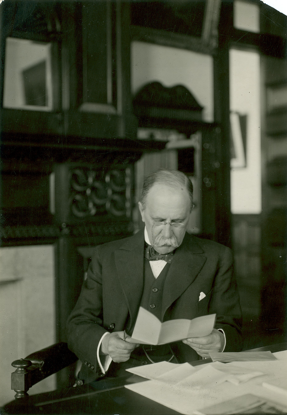 Description: William Osler at his desk at home, 13 Norham Gardens, Oxford, reading correspondence. Osler was Regius Professor of Medicine at Oxford University from 1905 to his death in 1919.