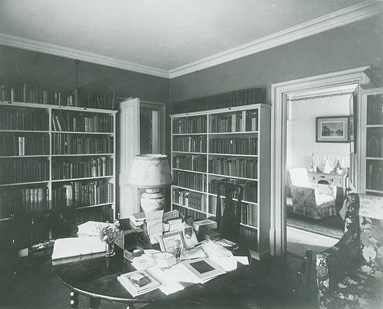 Description: The northwest corner of the sitting room at 13 Norham Gardens, the Oslers' home in Oxford from 1907 to their deaths. The Oslers entertained so often here, and housed visitors so frequently, that the house became known among friends as "The Open Arms". This series of 15 pictures was taken by John Farquhar Fulton, the doctor and bibliophile, before Sir William Osler's book collection was removed to McGill University. Osler bequeathed his library to McGill on his death in 1919; the Osler Library opened there in 1929.