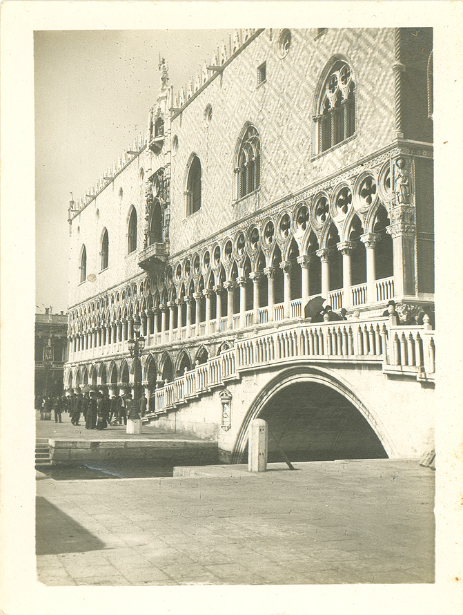 Description: The Palazzo Ducale, or Doge's Palace, in Venice, Italy, photographed by Revere Osler. Revere began to develop interests in photography and architecture in his adolescence. This photo is part of a series of twenty-two photos taken by Revere in northern Italy while the Oslers were vacationing there in 1912.