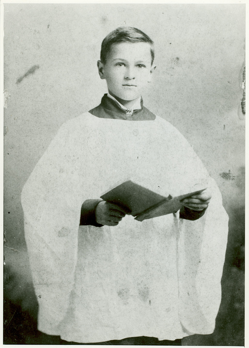 Description: William Willoughby Francis, the son of William Osler's first cousin, Marian Francis, and Osler's godson. Osler was close to Marian and her sister Jennette Osler, and was especially fond of Marian's children. He took an active interest in them throughout their lives. Francis, shown here in a choirboy's surplice, eventually became a doctor like his famous cousin; after Osler's death he compiled a catalogue of Osler's books, and became the first Osler librarian.