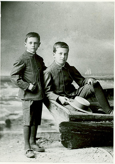 Description: William Willoughby Francis (left), at about nine years old, and his brother Gwyn Francis, about 14, sons of Marian Francis, first cousin of William Osler. Osler was close to Marian and her sister Jennette Osler, and was especially fond of Marian's children. He took an active interest in them throughout their lives. W. W. Francis, Osler's godson, eventually became a doctor like his famous cousin; after Osler's death he compiled a catalogue of Osler's books, and became the first Osler librarian.