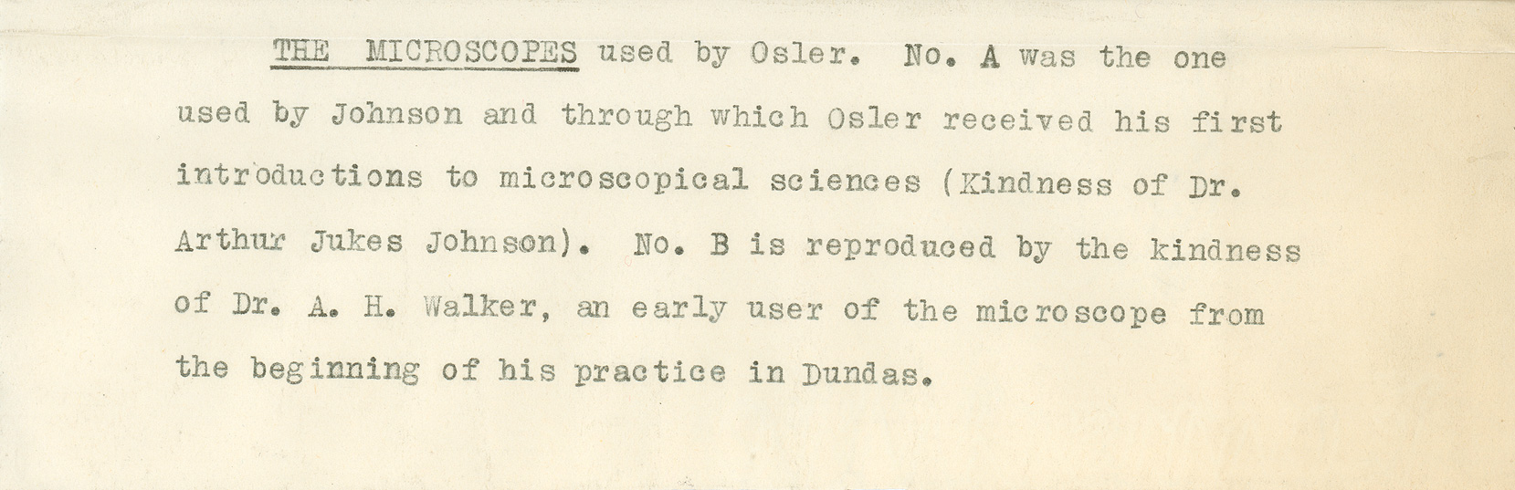 Title of picture. The Microscopes used by Osler. The middle one is Johnson's Microscope. The small one belongs to R.A.H. [sic] Walker, of Toronto, formerly of Dundas; early scientific work was done with this. The one to the right was used by Osler after graduation. (transcribed from accompanying note)