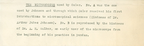 Title: Caption Accompanying a Photograph of Three Microscopes used by William Osler