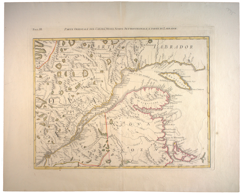 Zatta, Antonio, fl. 1757-1797. Parte orientale del Canadá , Nuova Scozia settentrionale, e parte di Labrador. -- Scale [ca. 1:2 100 000] (W 73º00'--W 60º00'/N 51º15'--N 46º00'). -- [Venice : Presso Antonio Zatta, 1778].