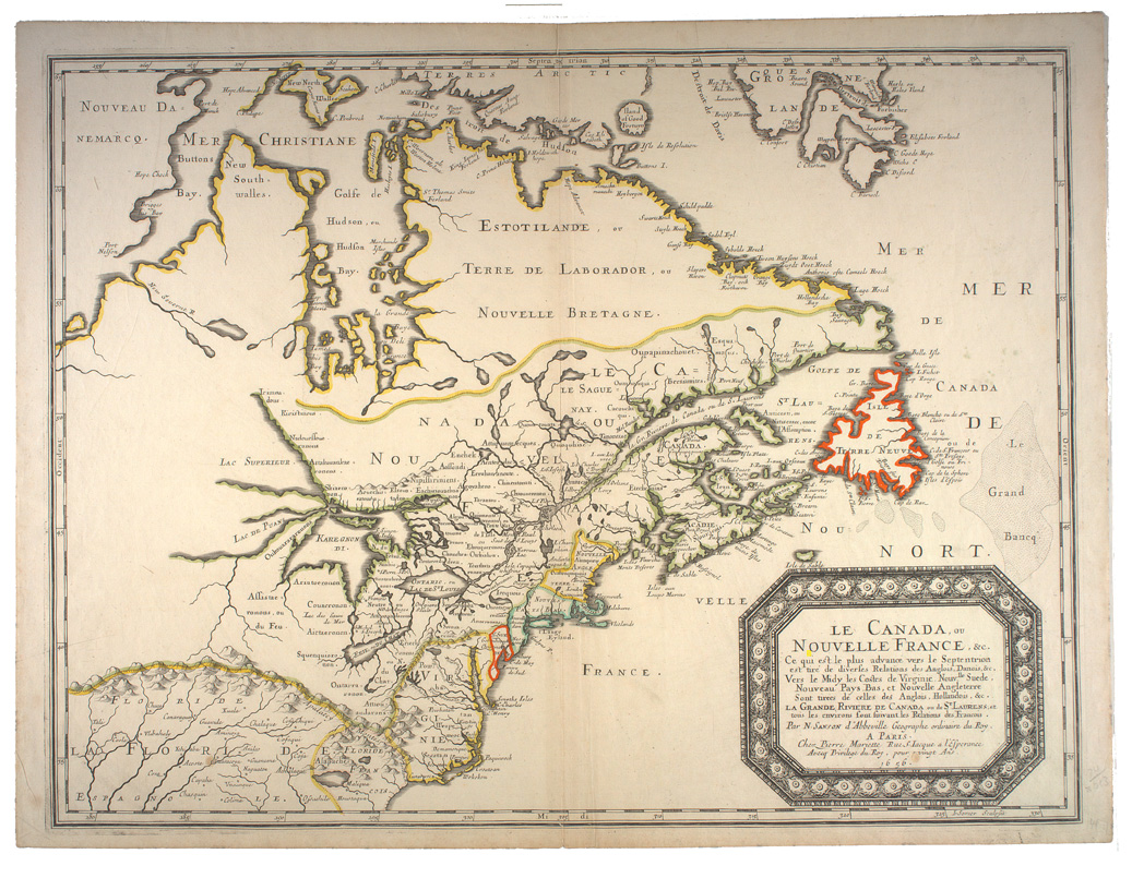 Sanson, Nicolas, 1600-1667. Le Canada, ou Nouvelle France, &c. ce qui est le plus advance vers le septentrion est tiré de diverses relations des Anglois, Danois, &c. vers le midy les costes de Virginie, Nouv[e]lle Suede, Nouveau Pays Bas, et Nouvelle Angleterre sont tirées de celles des Anglois, Hollandois, &c. La Grande Riviere de Canada ou de St Laurens, et tous les environs sont suivant les relations des Francois. / par N. Sanson d'Abbeville géographe ordinaire du Roy. A Paris, chez Pierre Mariette rue St Iacque a l'Esperance avecq privilege du Roy, pour vingt ans, 1656 ; J. Somer, Sculpsit?. --