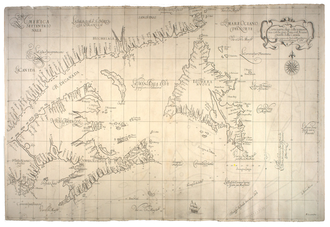 Dudley, Robert, Sir, 1574-1649. Carta particolare della terra nuoua con la gran baia et il fiume grande della Canida. La longitudine Conincia da l'Isola di Pico d'Asores. D'America Cara. prima Lº.6º?. --